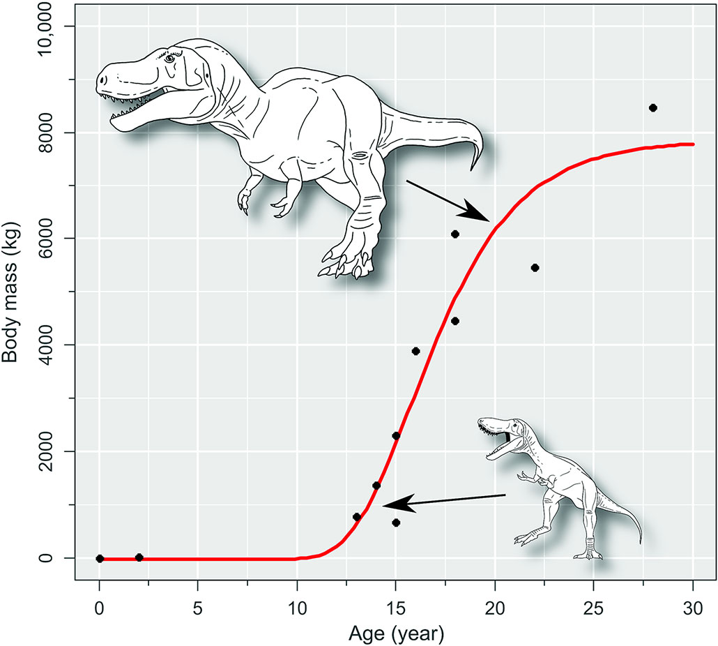 Figure A: Fossils can reveal information about an animal’s age and weight. For instance, patterns of growth in bones can hint at the age of an animal when it died. Based on reports of T. rex fossils, researchers made a growth curve for this species. The growth curve shows how the animals’ body mass increases with age.