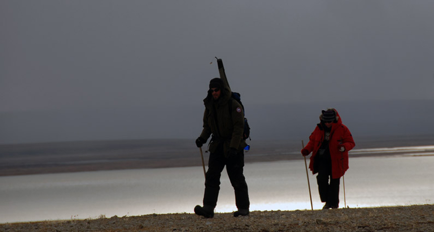 Arctic researcher Kathy Young (rear) walks back to her remote research cabin on Canada’s Bathurst Island with her student Valen Steer.