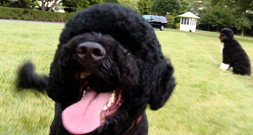A family dog may lead to fewer allergies in babies, a new study suggests. Shown here are Sunny and Bo, canines that live in the Obama White House.