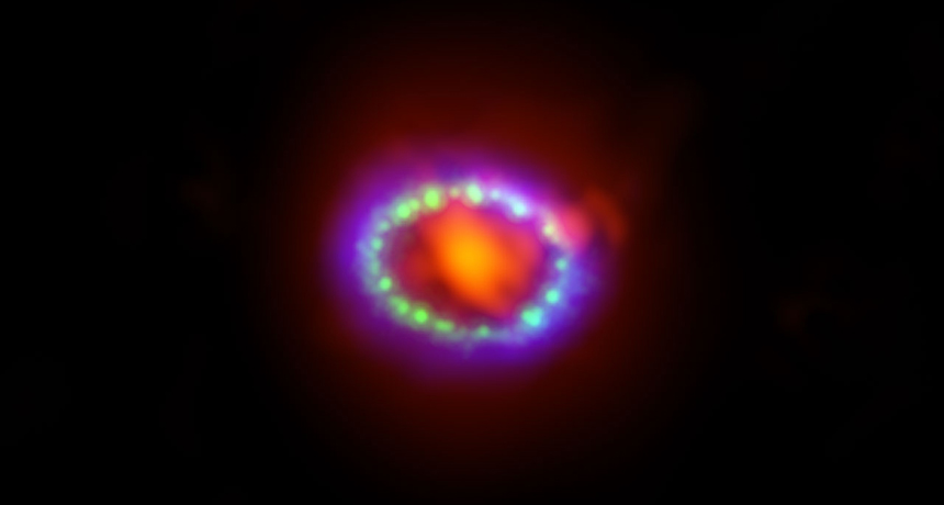 This is Supernova 1987A, an exploding star that first became visible in February 1987. Astronomers combined images taken with three different telescopes to produce this one. Dust in the center of the debris shows up as red. Scientists say supernovas like this one may have been responsible for spewing dust in the universe and boosting the formation of early stars.
