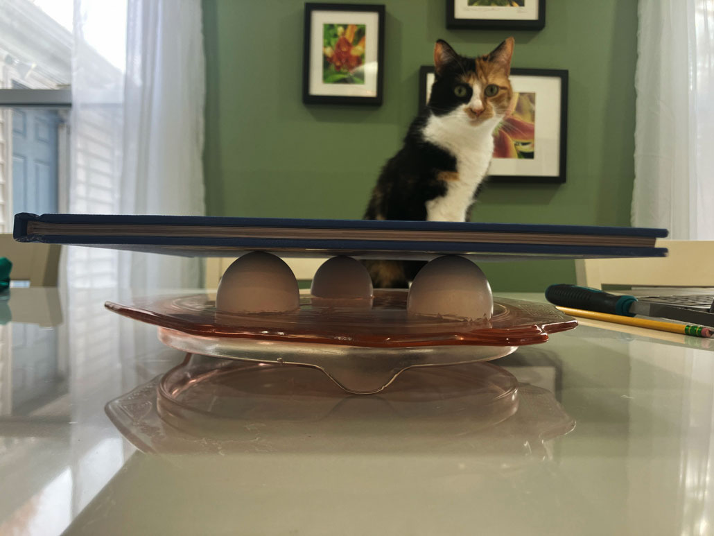 7. Carefully lay a hardcover book on top of the three eggshells, as shown in Figure 8. The book should be centered over the eggshells, so the mass will be distributed evenly among them.