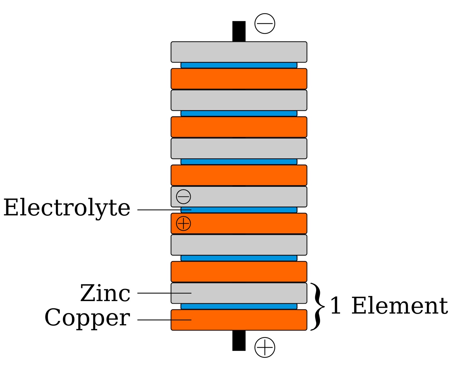You might think that batteries are a modern invention, but batteries were one of the first ways of making electricity. Alessandro Volta discovered the first electric battery in 1800. He made a giant stack of alternating layers of zinc, blotting paper soaked in salt water, and silver. This early design for a battery became known as the voltaic pile.