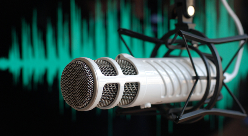Recording studio microphone picks up sounds — acoustic energy — displayed as waves in the background.