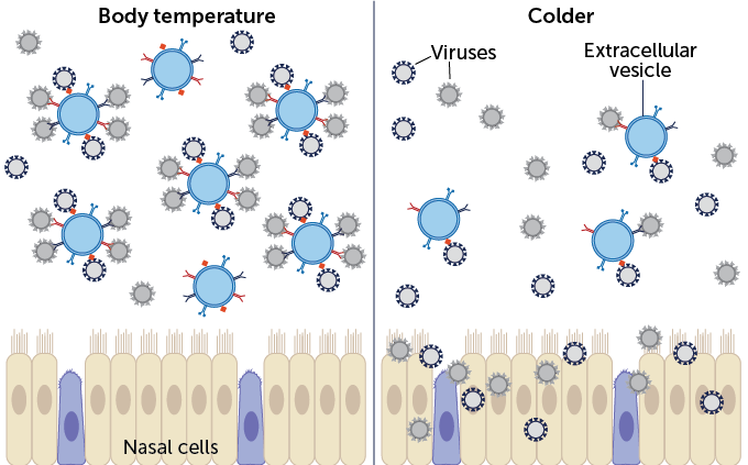 Cold temps may impede the body’s ability to make such virus-killing decoy bubbles. Bleier’s team grew human nasal cells in lab dishes at 37° Celsius (98.6° Fahrenheit). That is our typical body temperature. The researchers measured how many bubbles the cells released. Then, the scientists lowered the thermostat to 32° C (89.6° F). Cells released about 42 percent fewer bubbles at the cooler temperature. What’s more, those vesicles carried fewer virus-killing weapons. Vesicles can pack in about 24 percent more microRNA at body temperature than when it is cooler.