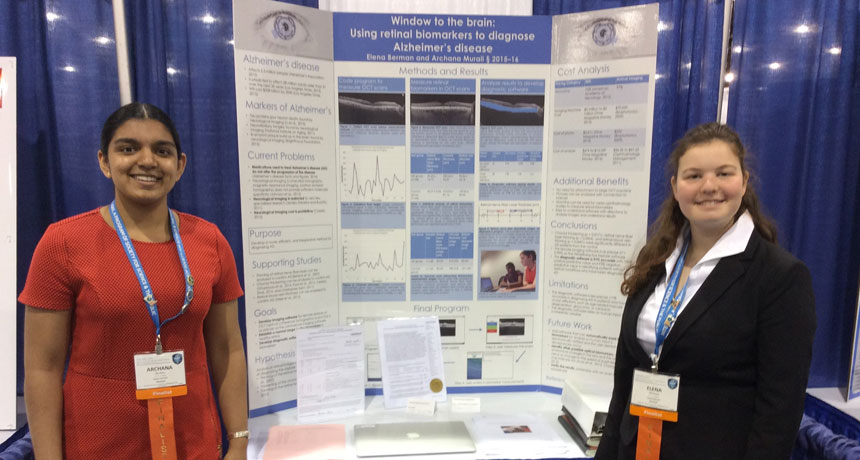 Today, brain scans are only 75 percent accurate in diagnosing Alzheimer’s disease, Archana and Elena note. Based on their early analysis, the new technique appears to be more than 95 percent accurate. It also would be far less expensive, the teens say. While the cost of a brain scan is around $2,600, eye doctors can take an image of a patient’s eyes for about $100. So, if proven, the teens’ new technique could easily become part of a routine eye exam.