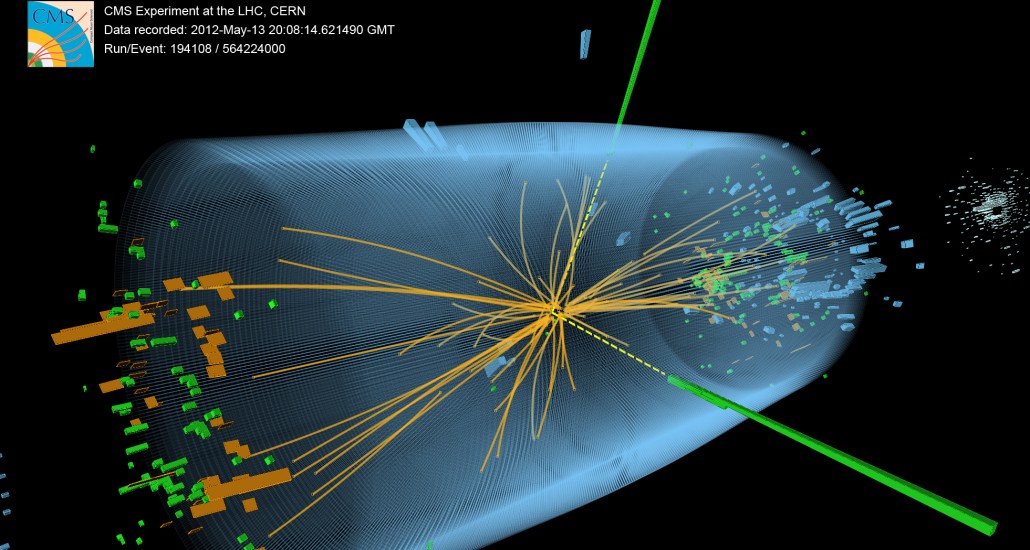 This representation shows that almost immediately after a Higgs particle was created in 2012, it “decayed” into two photons of light. A detector depicts the tracks of those photons as green lines.