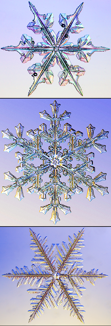 Depending on the temperature, these hexagons join with each other and grow in different ways. Sometimes, they make needles. Others may form branch-like dendrites. All are beautiful. And all have their own unique story of crystal growth.