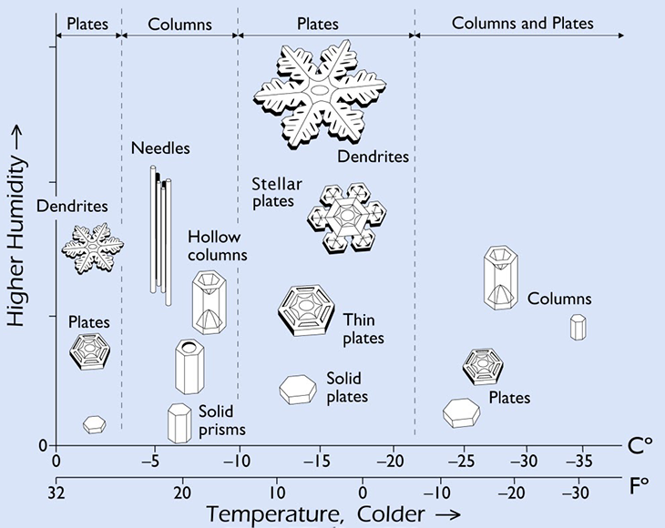 In winter, the air up there can be very cold — and will get chillier the higher you go. To form snowflakes, those clouds need to be below freezing. But not too cold. Snowflakes form from the moisture in a cloud. If the air gets too cold, a cloud won’t hold enough water for anything to precipitate out. So there has to be a balance. That’s why most flakes develop at or just below freezing — 0º Celsius (32º Fahrenheit). Snow can form in cooler environments, but the colder it gets, the less moisture will be available to make a snowflake.