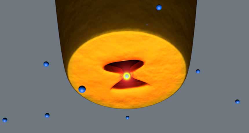 In earlier experiments, they had observed that electrons swimming around in metals, such as gold, could act like nano-sized lenses and redirect light into tiny spaces. (Electrons are particles that carry a negative charge. They move freely across metals such as gold.) The physicists put that idea to work in their new tweezers.
