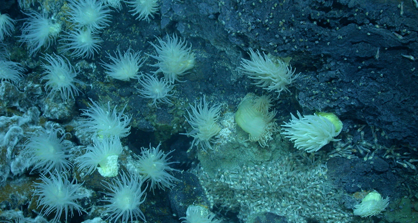 In some spots, methane — a form of natural gas — seeps from the ocean floor. There, bacteria that eat methane form the center of a rich food web. In other regions, hydrothermal vents pepper the seafloor. Scalding hot water rich in minerals spews from these sites. Those minerals nourish a variety of creatures, from barnacles and tube worms to mussels, shrimps and enormous bacteria that you can see with the unaided eye. Fueling all of these creatures are those chemicals being vented into the water.