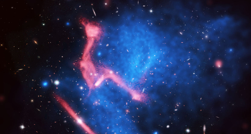 The image is a composite of X-ray and radio-wave data. It shows four galaxy clusters colliding. Gas (blue) heated to many millions of degrees Celsius fills the space between galaxies. The smashup sent a fountain of charged particles along a jet (red, center) that is 2.5 million light-years long.