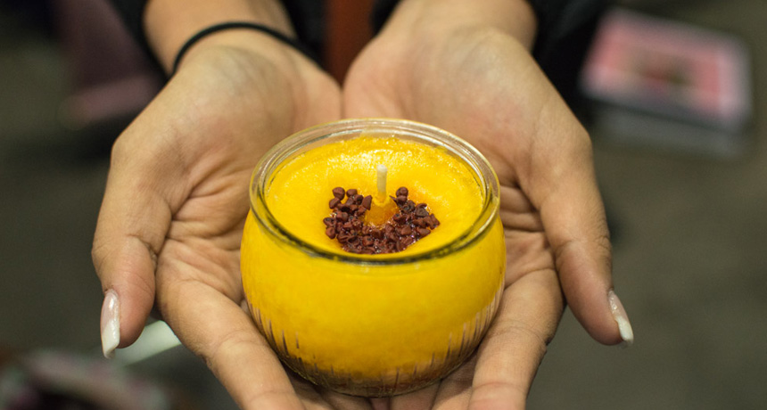 The wax in this candle includes extracts from seeds of the common plant Bixa orellana (seeds shown atop candle). Smoke from the candle can repel mosquitoes.