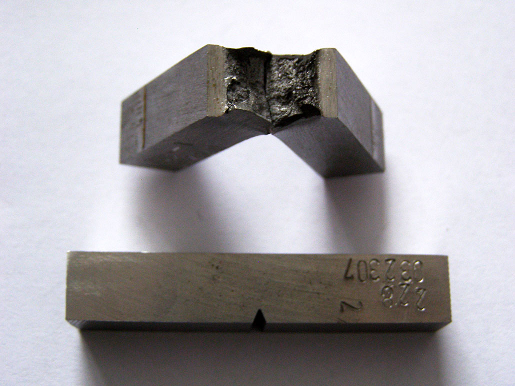 Move along to the hardware aisle and you’ll find something called a Charpy. This small, rectangular piece of steel with a V-shaped notch in the middle might not look like a big deal. But these metal bits are NIST’s most popular reference material — and for good reason. They help prevent many types of disasters.