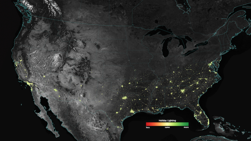 Cities shine even brighter during the holidays. Here, green highlights where nighttime lights in December are at least 50 percent brighter than the rest of the year.
