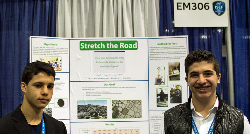 So 16-year-old Mohammad and his research partner, 15-year-old classmate Adam Belaid, came up with the idea of adding rubber to asphalt to improve road quality. But that rubber doesn’t need to be new — it can come from old tires. Even a worn-out tire contains a lot of rubber, which means that the material should be plentiful, says Mohammad. Drivers in Jordan replaced 9 million tons of tires between 2006 and 2010, and only 0.3 percent of that rubber was recycled. That leaves a lot of rubber that could potentially go into road construction.