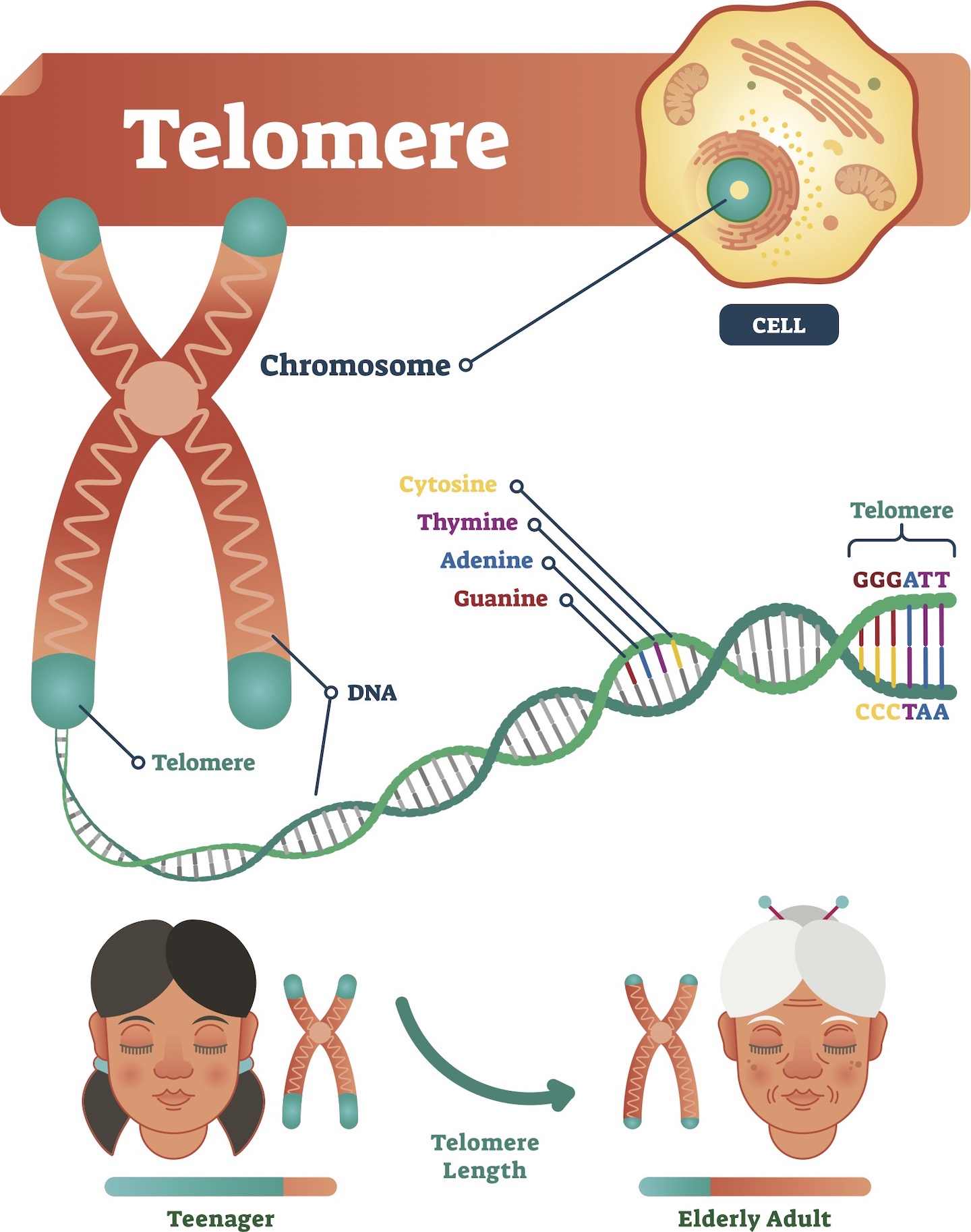 Telomeres are protective caps on the tips of chromosomes inside cells. Like the rest of the DNA in chromosomes, telomeres are made up of chemical building blocks — cytosine, thymine, adenine and guanine. But telomeres are special, in that they are made up of a short series of those building blocks repeated over and over again. Because telomeres contain many copies of the same series of building blocks, bits of telomeres can be lost during cell replication without losing any important genetic information. Each time a cell divides, the telomeres in its chromosomes get worn down a little more. This shortening of cells’ telomeres has been linked to aging.