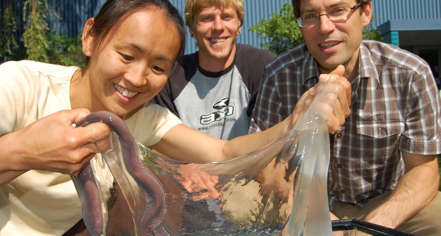 Douglas Fudge (at right) studies the slime produced by hagfish, a sea creature that eats dead animals on the ocean floor.