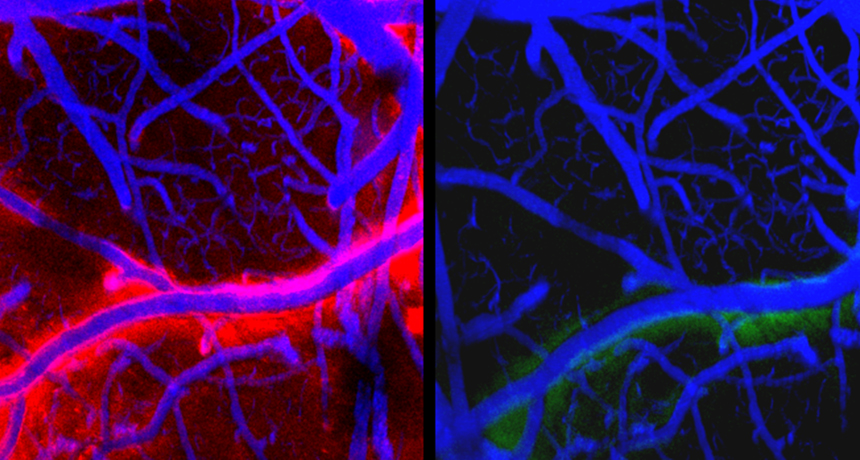 In a sleeping mouse, dyed fluid (red) seeped deeply into the spaces between brain cells. But when a mouse was awake, fluid (green) didn’t flow very far.