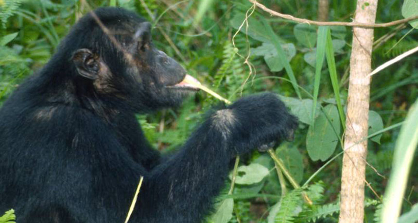 This chimp, nicknamed Jilba, chews on the pith of the mjonso plant in Tanzania’s Mahale Mountains National Park. Researchers believe chimps seek out the medicinal shrub to rid themselves of parasitic infections.