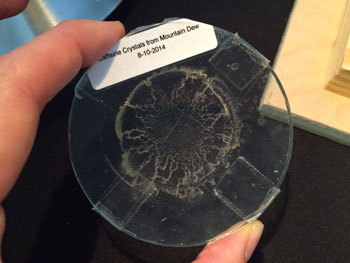But it wasn’t enough to move the caffeine into the ethyl acetate and some water. To measure the caffeine, he wanted collect it as a dry powder. So Max added heat until the ethyl acetate boiled off. Traces of water remained, so the teen added magnesium sulfate and calcium chloride. The two chemicals, which are very attracted to water, dried out his samples. At last he had pure caffeine crystals, which he could now weigh.