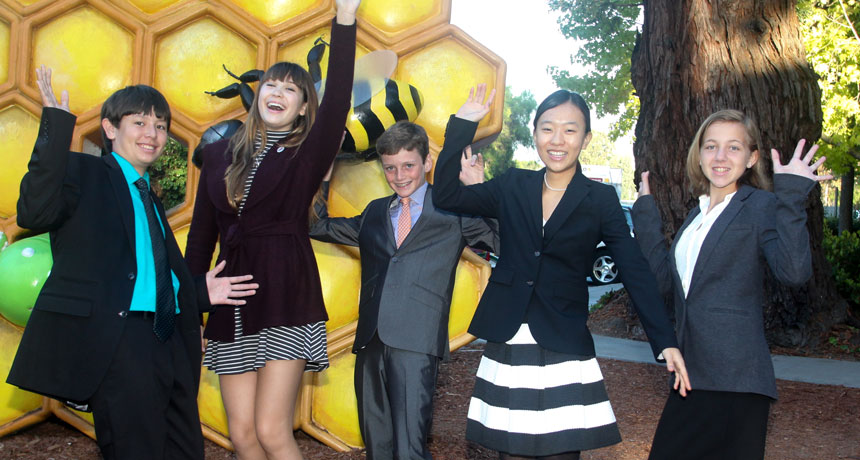 Students at the Broadcom MASTERS show off their spirit at the Google android garden.