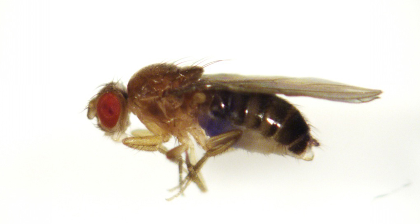 This fruit fly has a blue belly, proof that it ate blue-dyed erythritol. The sweetener is harmless to people, but deadly to fruit flies.